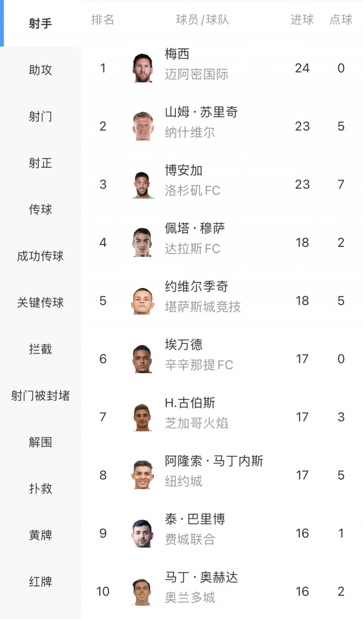 Miami Miami 4-1 New England Revolution, Messi hỗ trợ và ghét, và mùa này, anh đã vươn lên vị trí thứ hai trong danh sách hỗ trợ. Về mặt danh sách ghi bàn, Messi được xếp hạng đầu tiên với 24 bàn thắng và 0 hình phạt.