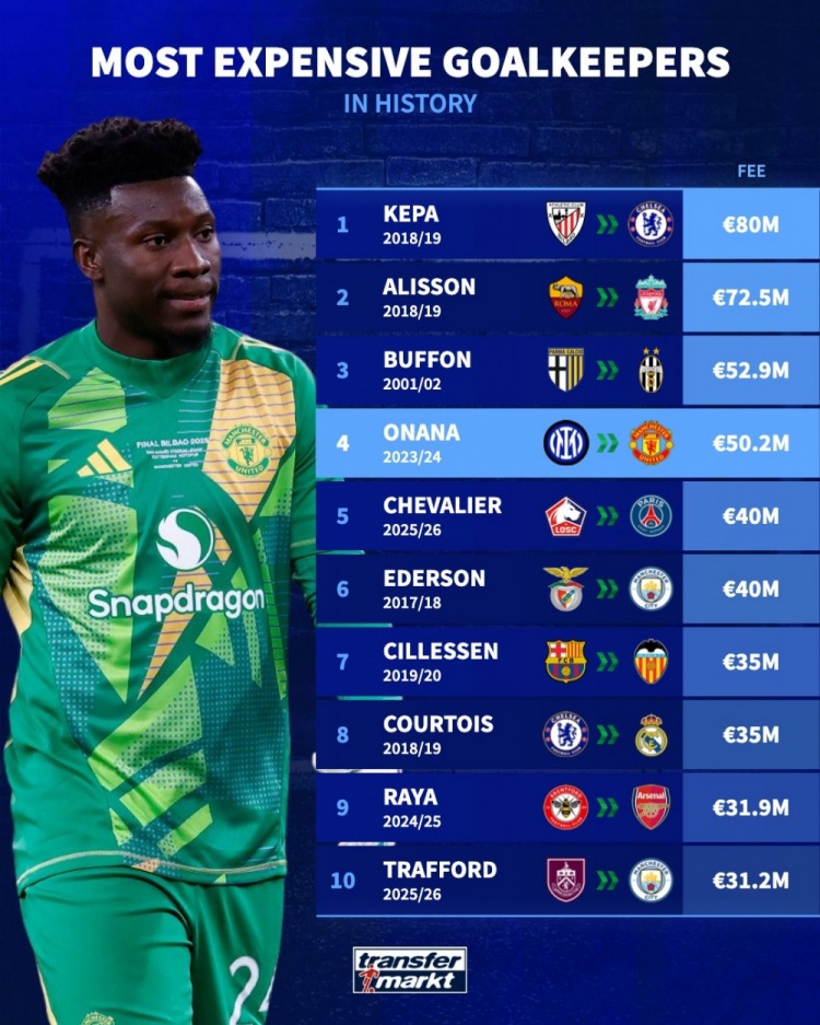 Thị trường chuyển nhượng Đức đã đếm phí chuyển nhượng của thủ môn và liệt kê nó trong danh sách. Kepa xếp hạng đầu tiên với 80 triệu euro, trong khi Allison, Buffon và Onana xếp hạng trong top bốn.